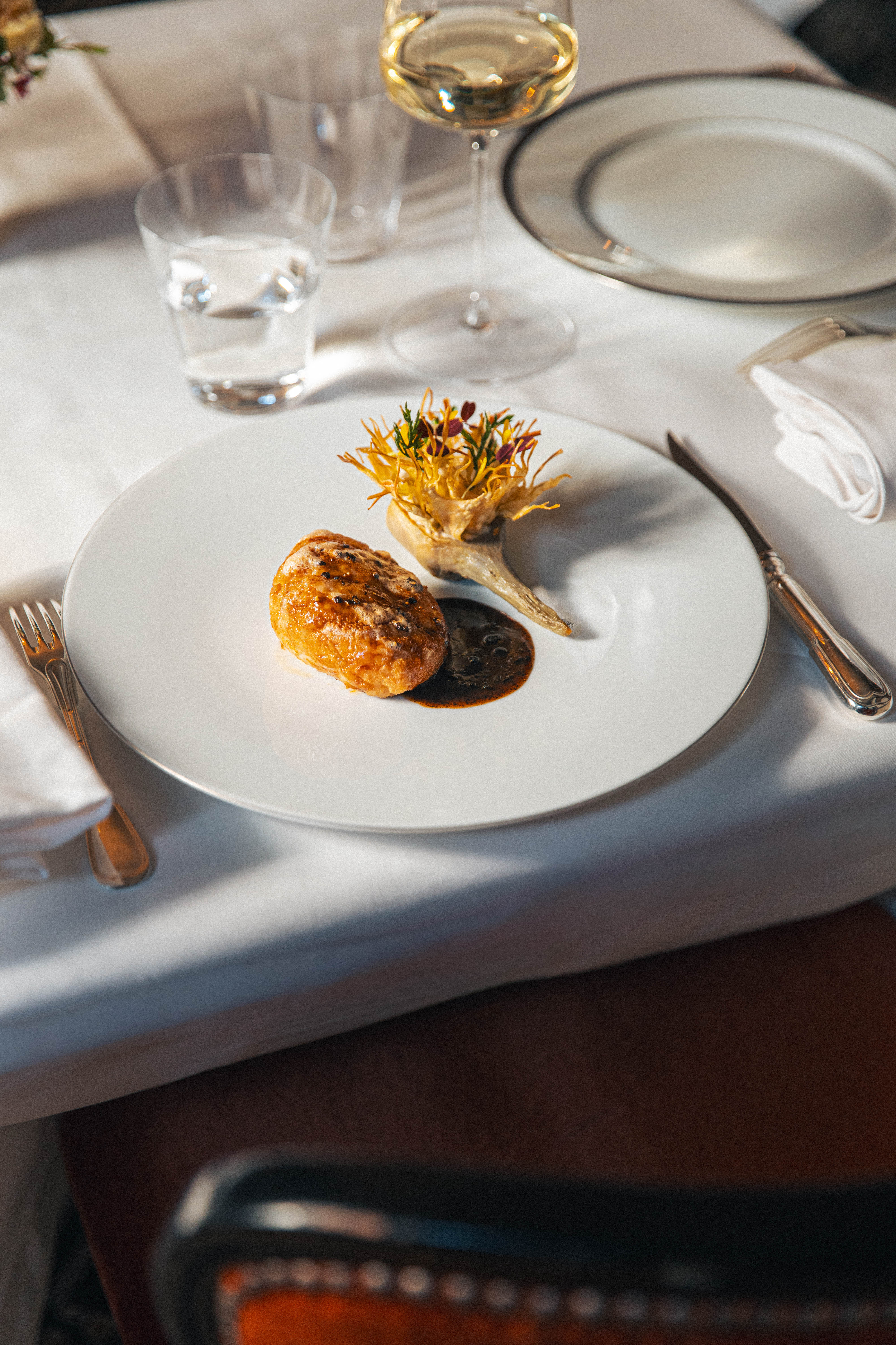 Viennoise de sole aux asperges, sabayon aux câpres et citron caviar